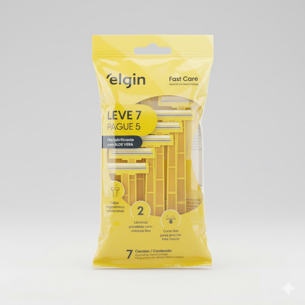 1 cartela promocional contendo 7 barbeadores descartáveis Elgin de 2 lâminas